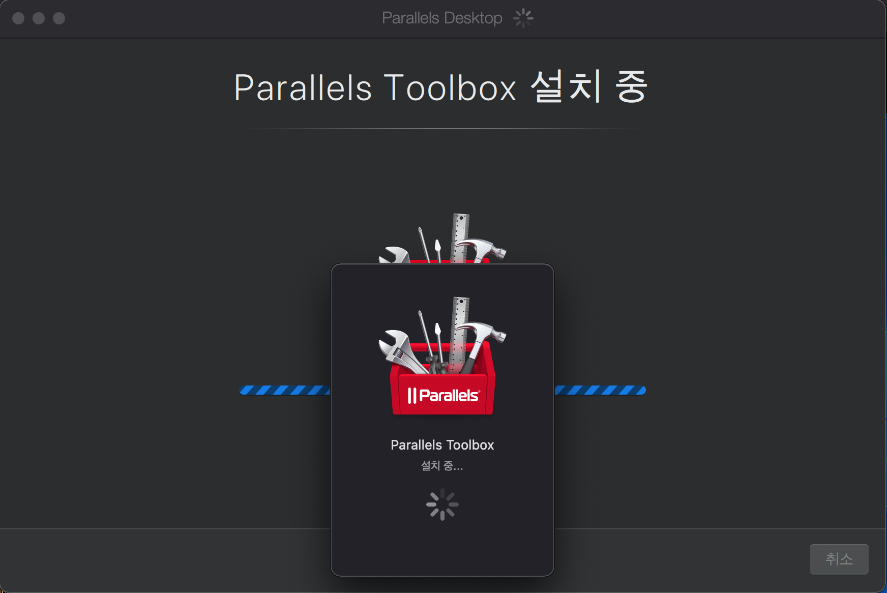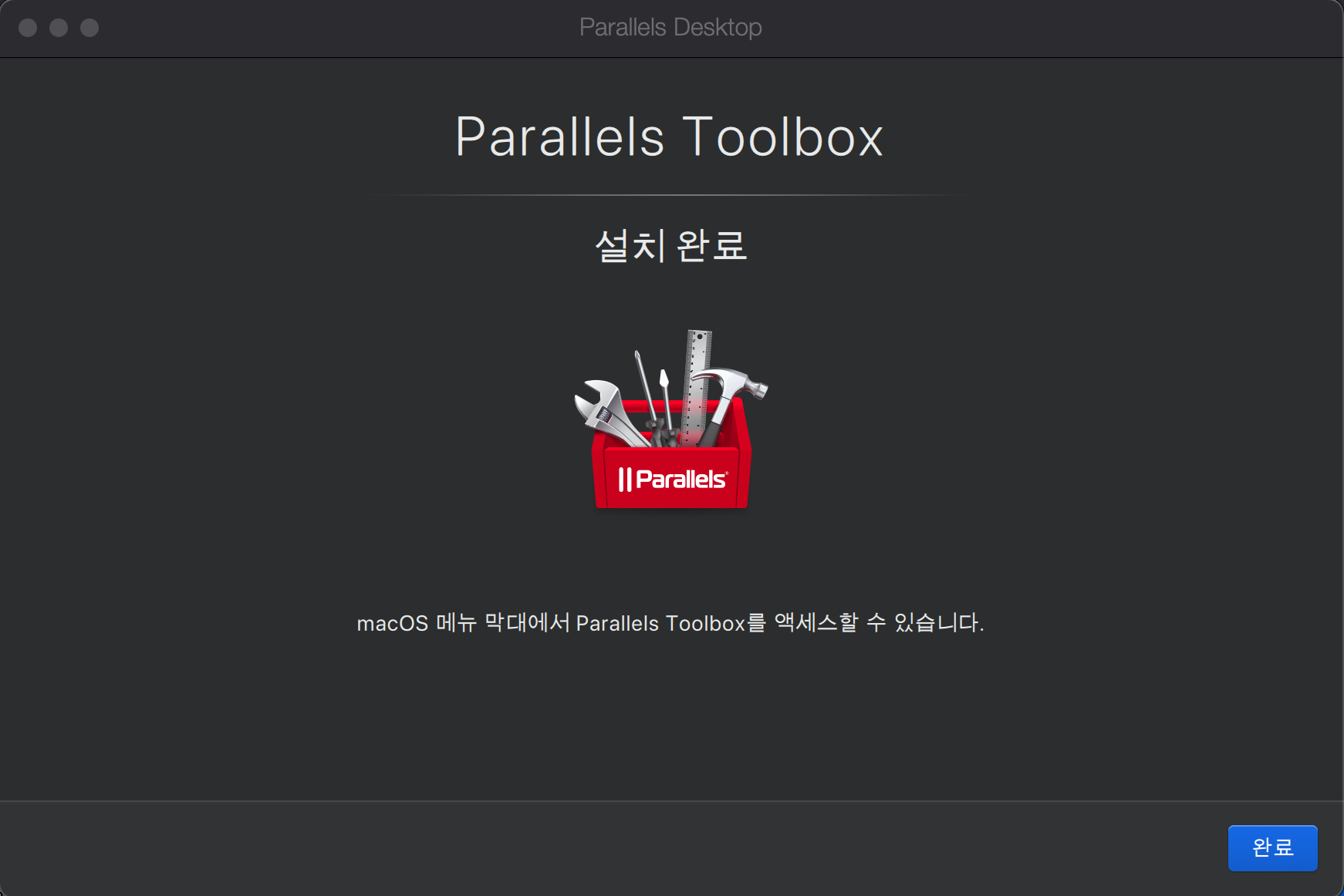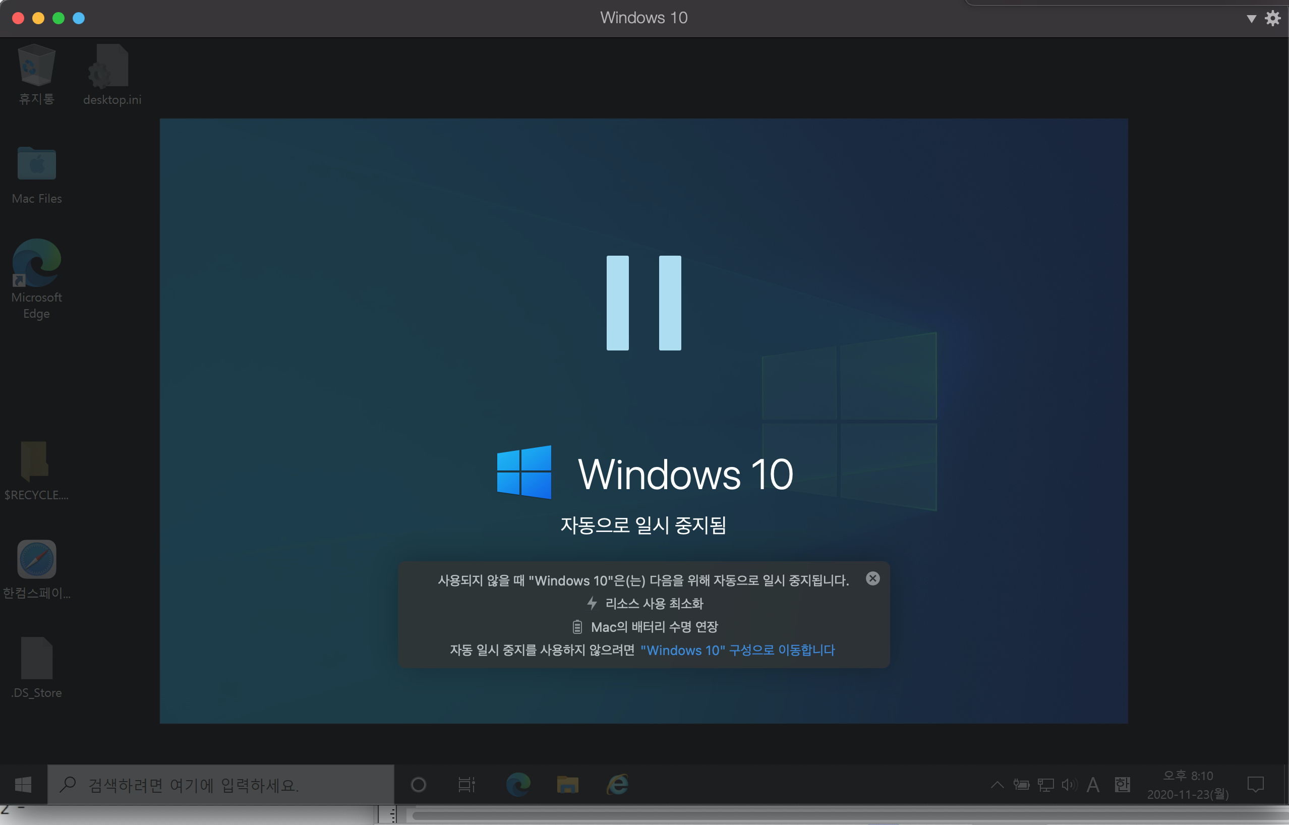 툴박스도 설치가 추가로 되고, 맥OS에서 구동될 때에는 메모리 관리를 위해서 패러럴즈의 윈도우10을 일시 중지시켜 놓네요.