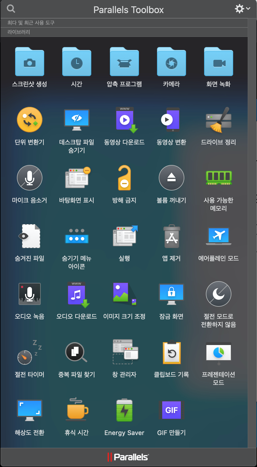 패러럴즈 툴박스에서 사용할 수 있는 앱 목록이에요. 오늘은 한꺼번에 사용법을 올리진 못하지만