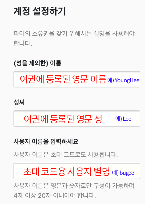 5. 여권이나 신분증에 등록되어 있는 영문 이름을 등록합니다(면허증이나 주민등록증으로 인증받을 경우에는 한글로 이름을 입력하면 됩니다.). 그리고 사용자 이름은 초대 코드로도 사용할 예정이므로 영문과 숫자를 이용하여 생성합니다.