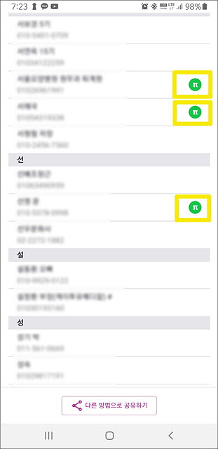 3. 전화번호 목록이 뜨면 10초 정도 기다렸다가 목록을 훑어봅니다. 전화번호 목록 옆에 [파이] 모양 아이콘이 뜨는 사람을 볼 수 있는데, 이 분들 또한 파이를 채굴하고 있는 분들입니다.