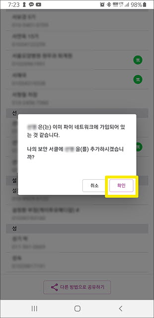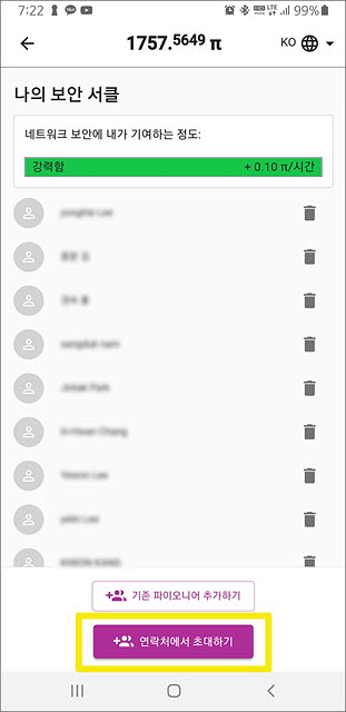 3. 전화번호 목록이 뜨면 10초 정도 기다렸다가 목록을 훑어봅니다. 전화번호 목록 옆에 [파이] 모양 아이콘이 뜨는 사람을 볼 수 있는데, 이 분들 또한 파이를 채굴하고 있는 분들입니다.