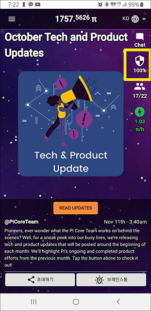 1. 파이코인을 채굴한지 3일이 지나면 방패 모양의 아이콘이 생깁니다. 이 방패가 100%가 되야 파이 채굴양을 최대한으로 할 수 있습니다. 방패 아이콘을 누릅니다.